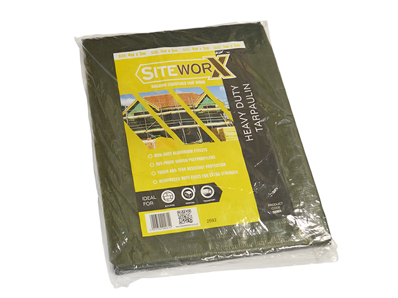 The Siteworx heavy duty tarpaulin provides all-weather protection for every project. These tough tarpaulins are made of rot-proof woven polypropylene to withstand tearing. Non-rust aluminium eyelets and reinforced rope edges give extra durability and strength.